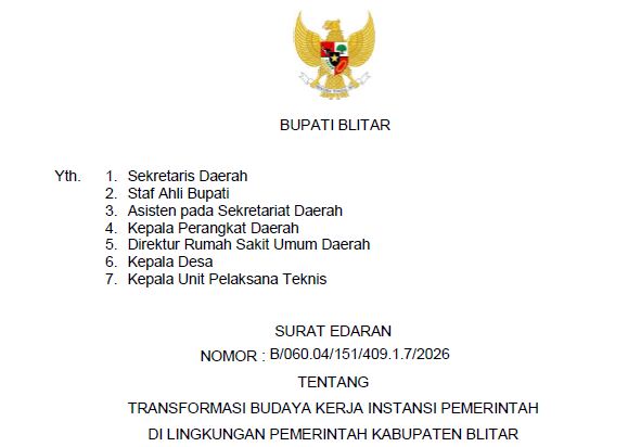 Srengat/Blitar – Pemerintah Kecamatan Srengat mulai menerapkan sistem Work From Home (WFH) bagi aparatur mulai Jumat, 10 April 2026. Kebijakan ini dilaksanakan sesuai dengan Surat Edaran Bupati Nomor : B/060.04/151/409.1.7/2025 Tentang Transformasi Budaya Kerja Instansi Pemerintah di Lingkungan Pemerintah Kabupaten Blitar sebagai bentuk penyesuaian pola kerja yang adaptif, efektif, dan tetap berorientasi pada pelayanan prima kepada masyarakat.